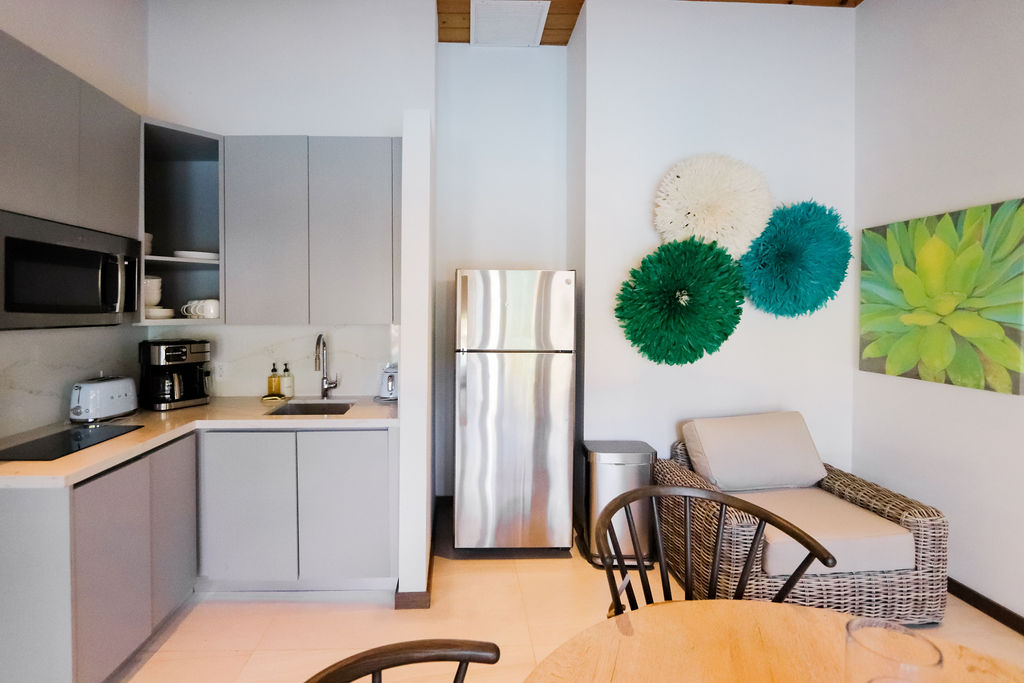 • Kitchenette with stovetop, microwave, refrigerator (no oven)